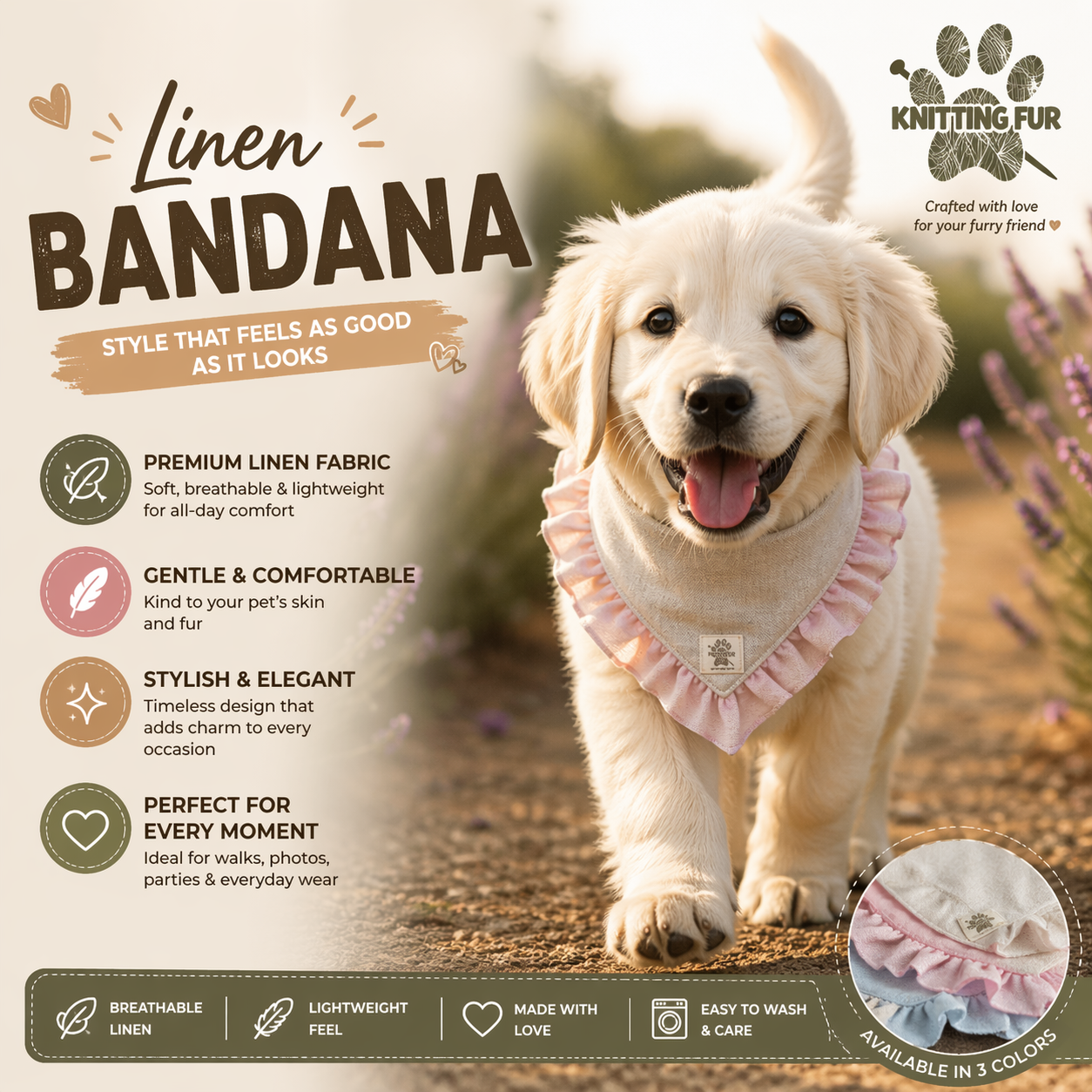 Add a touch of effortless style to your pet’s look with our Linen Bandana. Crafted from soft, breathable linen, it keeps your furry friend comfortable while looking absolutely adorable.